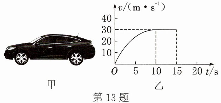 13. 爸爸驾驶满载质量为$1.8×10^{3}kg$的小轿车带小明去旅行,如图甲所示,若汽车做直线运动,牵引力的功率恒为$1.2×10^{5}W$。运动过程中受到的阻力保持不变,运动的速度v与时间t的关系如图乙所示,则(g取10N/kg):