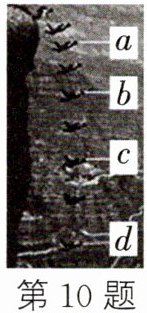 10. 如图所示是每0.3s拍摄一次的频闪照片,它记录了极限跳伞运动员从悬崖上跳下到打开降落伞之前的运动过程。若空气阻力忽略不计,在ab段运动员所受重力做功为$W_{1}$,做功功率为$P_{1}$;在cd段重力做功为$W_{2}$,做功功率为$P_{2}$,下列判断正确的是()