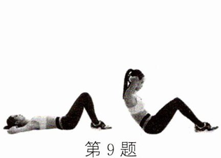 9. 如图为运动员在做仰卧起坐,其体重为750N,上半身的重量为体重的$\frac {3}{5}$,仰卧起坐时上半身重心上升的高度均为0.3m,做一次仰卧起坐,其克服重力做功约为____J;她一分钟做48个,则该运动员的平均功率约为____W。