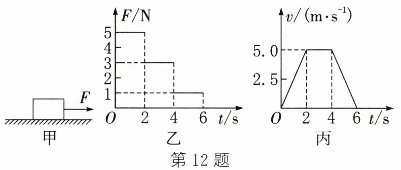 12. 如图甲所示,物体在水平拉力F的作用下由静止沿粗糙水平面向右运动,0~6s内拉力随时间变化的规律如图乙,速度随时间变化的规律如图丙,则在2~4s内,物体克服摩擦力做功的功率为()