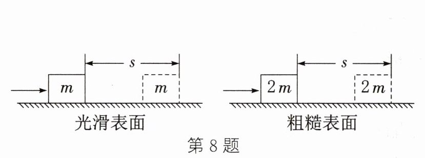 8. 如图所示,小明先后两次用同样的时间、同样大小的力,将不同质量的物体在不同的表面上分别移动相同的距离。该力在此过程中所做功分别为$W_{1}$、$W_{2}$,功率分别为$P_{1}$、$P_{2}$,它们的大小关系是$W_{1}$____$W_{2},P_{1}$____$P_{2}$。