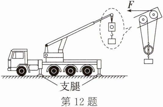 12. (2024·广州)如图,吊车在建筑工地进行作业时,由支腿将吊车撑起并脱离地面,吊臂上的滑轮组在$1\mathrm{s}$内,将重为$9× 10^{3}\mathrm{N}的建筑材料沿竖直方向匀速提升1\mathrm{m}$,滑轮组上钢丝绳自由端受到的拉力$F为5× 10^{3}\mathrm{N}$。
