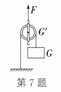 7. 如图所示,动滑轮重$12\mathrm{N}$,物重$50\mathrm{N}$。现以$0.2\mathrm{m}/\mathrm{s}的速度将滑轮竖直向上匀速拉动1\mathrm{m}$,测得拉力$F大小为120\mathrm{N}$,此过程中拉力做的有用功为____$\mathrm{J}$,滑轮的机械效率为____(不计绳重)。