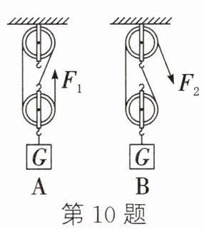10. 如图所示,工人们用同一滑轮组,根据需要有两种方式来提起等重的建筑材料,若不计摩擦和绳重,则$F_{1}$____$F_{2}$,有用功$W_{1}$____$W_{2}$,机械效率$\eta_{\mathrm{A}}$____$\eta_{\mathrm{B}}$。($> / = / <$)