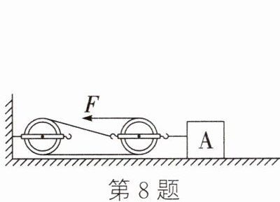 8. 如图所示,小强在$1\mathrm{m}\mathrm{i}\mathrm{n}内用滑轮组将物体A沿水平地面匀速移动10\mathrm{m}$,已知物体$A重为400\mathrm{N}$,它受到的摩擦力为$90\mathrm{N}$,小强所用拉力为$40\mathrm{N}$,则$A$的重力做功为____$\mathrm{J}$,总功为____$\mathrm{J}$,此滑轮组的机械效率为____。