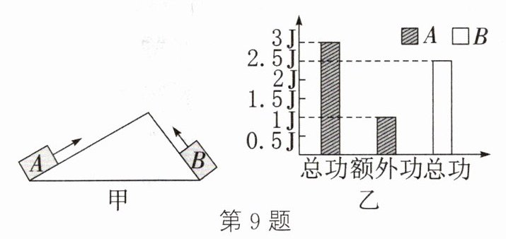 9. 如图(甲)所示,$A$、$B$是两个完全相同的物体,小明同学分别将$A$、$B$两物体拉到斜面顶端,对物体做功情况如图(乙)所示,则对物体$A$做的有用功是____$\mathrm{J}$,对物体$B$做的额外功是____$\mathrm{J}$,拉$B$物体的斜面的机械效率为____。