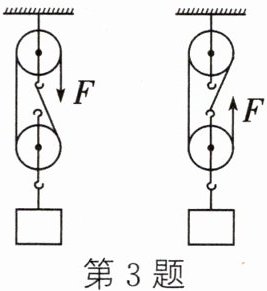 3. 如图所示,小明用两个不同的滑轮组,在相同时间内分别用大小相等的拉力F将同一物体匀速提高相同的高度,若两个滑轮组的动滑轮重分别为G动1和G动2,机械效率分别为η1、η2,不计绳重和摩擦,则 ()