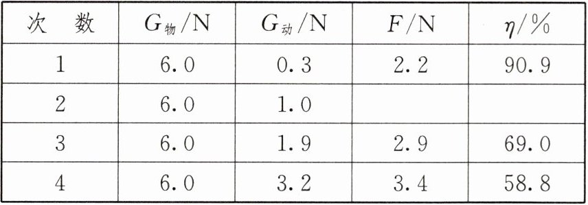 (2) 第2次实验中拉力F的示数如图乙,读数为______N,第2次实验滑轮组的机械效率为______%。分析数据可知:在物重不变的情况下,动滑轮越重滑轮组的机械效率越______。