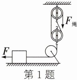 1. (2024·泸州)如图所示的滑轮组忽略绳重及绳与滑轮间的摩擦,将物体放在水平粗糙桌面上。受到水平向左的恒力$F= 100N$,滑轮组绳子自由端受到的拉力为$F_{绳}$。当绳子自由端的拉力$F_{绳}$为60N时,物体处于静止状态,物体与桌面间的摩擦力恰好为0,则动滑轮的重力为______N;当绳子自由端拉力$F_{绳}$为90N时,物体水平向右匀速运动,物体与桌面之间的滑动摩擦力为______N;撤去水平向左的恒力F,改变绳子自由端拉力$F_{绳}$的大小,仍使物体水平向右匀速运动时,滑轮组的机械效率为______。