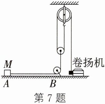 7. (2024·宜宾)质量为500kg的物体M,用如图所示的滑轮组沿水平方向将物体M从A点匀速拉到B点,AB距离为10m,物体M在地面滑动过程中受到的阻力是其重力的0.2倍,在此过程中,因动滑轮和绳的重力以及绳与滑轮间的摩擦而做的额外功$W_{0}= 200J$,g取9.8N/kg。求在此过程中: