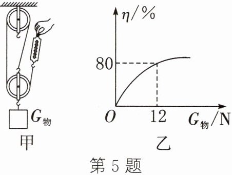 5. 现用如图甲所示的装置来探究滑轮组的机械效率$\eta与所挂物重G_{物}$的关系,改变$G_{物}$,竖直向上匀速拉动弹簧测力计,计算并绘出$\eta与G_{物}$关系如图乙所示,若不计绳重和摩擦,则:动滑轮自重为______N;图乙中曲线表明,同一滑轮组的机械效率$\eta随所挂物重G_{物}$的增大而增大,最终______(会/不会)达到100%;仅改变图甲中的绕绳方式,重复上述实验,所得到的$\eta -G_{物}$图线与图乙所示曲线______(相同/不同)。