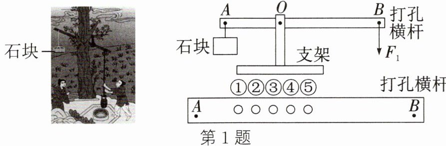 1. 小明仿照《天工开物》中记载的桔槔,制作如图所示的模型,以第③孔位置作为支点O,横杆水平静止时,B处所受动力为$F_{1}$,A处所受阻力为$F_{2}$。不计摩擦和横杆重力。