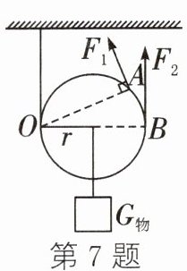 7. 如图所示,小明在“探究动滑轮工作特点”的实验中,滑轮第一次受到$F_{1}$的作用,第二次受到竖直向上$F_{2}$的作用,物体都被匀速向上提起,已知物体重力为$G_{物}$。若不计摩擦和绳重,则下列说法正确的是()