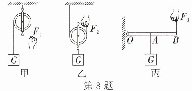 8. (2024·东营)如图所示,用甲、乙、丙三种简单机械分别提起同一重物G,已知滑轮重20N,杠杆($OB = 2OA$)重10N,手的拉力始终沿竖直方向,忽略绳重及摩擦,下列说法错误的是()