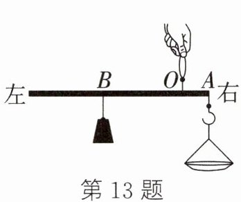 13. (2024·哈尔滨)杆秤在我国有几千年的历史,如今中药房仍在使用。如图所示,已测得刺五加药材质量是120g,其中$OB = 3OA$,若不计杆秤自重,则秤砣的质量约为______g,接下来要测30g的人参片,需要将秤砣向B点的______(左/右)侧移动。
