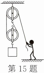 15. (2024·广元)假期期间,小明随爸爸去建筑工地劳动体验。用如图所示的滑轮组来提升材料,当提升的材料重力为300N时,滑轮组机械效率为75%,则动滑轮的重力为______N;若绳子能承受的最大拉力为500N,则该滑轮组能提起材料的最大质量为______kg(空气阻力、摩擦力及绳重不计,g取10N/kg)。
