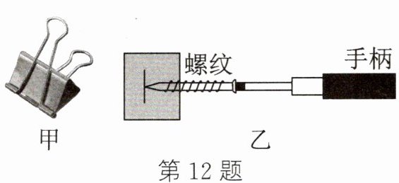 12. 简单机械是人类在改造自然中运用机械工具的智慧结晶。如图甲所示是同学们常用的燕尾夹,它和滑轮一样,都可以看作是一个______;图乙中的螺纹和盘山公路一样,都属于______(滑轮/斜面),手柄粗且螺纹______(密/稀)一些的螺丝钉拧起来更省力。