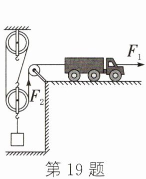 19. (2024·泰安)如图所示,汽车通过滑轮组将物体吊起。已知汽车的质量为$3×10^{3}kg$,牵引力$F_{1}$为4000N,对绳子的拉力$F_{2}$为2500N;物体的重力为6000N,物体匀速上升的速度始终为0.5m/s,汽车受到的摩擦力为汽车重力的0.05倍,g取10N/kg。下列说法中()