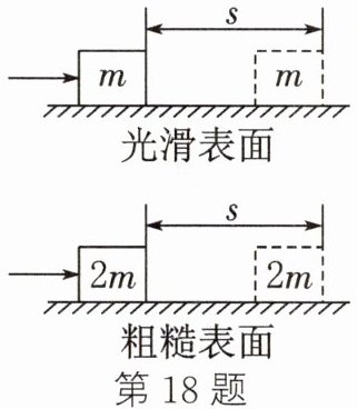 18. (2024·连云港)如图所示,一个人先后两次用同样的时间、同样大小的力,将不同质量的物体在不同的表面上分别移动相同的距离。该力在此过程中所做功的大小分别为$W_{1}$、$W_{2}$,功率的大小分别为$P_{1}$、$P_{2}$,关于它们之间的大小关系说法正确的是()