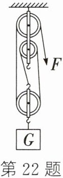 22. 如图所示的滑轮组,不计绳重及摩擦,大明在绳的自由端施力F,在20s内将重为450N的货物匀速提升4m,此过程中拉力F做功的功率为120W。求: