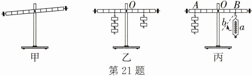 21. (2024·自贡)如图所示,小王在“研究杠杆平衡条件”的实验中所用的实验器材有:刻度均匀的杠杆、支架、弹簧测力计、刻度尺、细线和质量为50g的钩码若干个(g取10N/kg)。