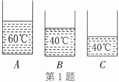 1. ______叫做内能,影响物体内能的因素有______。当物体或物体的不同部分之间存在______时,就会发生热传递,能量从高温处转移到低温处,直至______。如图,有A、B、C三杯水,A、B两杯水的质量相等,且比C杯水的质量大,水的温度如图所示,______杯中水的内能最大,______杯中水的内能最小(A/B/C)。