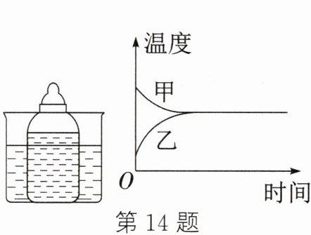 14. 把凉牛奶放在热水中加热较长一段时间,水和牛奶的温度随时间变化的图像如图所示。由图可知,______是水的温度变化图线,______是牛奶的温度变化图线,在这个过程中,______(能量/温度)从热水传递给牛奶。