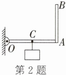 2. 如图所示,OAB为一可绕O点自由转动的轻质杠杆,OA垂直于AB,且OA长度为40cm,AB长度为30cm,在OA中点C处挂一质量为1kg的物块,要求在端点B处施加一个最小的力F,使杠杆在图示位置平衡,则力F的力臂应是____cm,最小的力F是____N。(g取10N/kg)