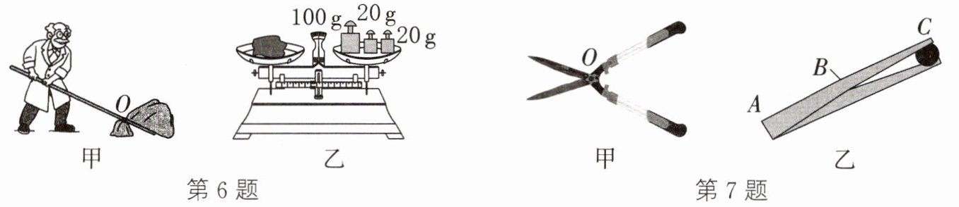 7. 如图甲所示是园艺工人修剪树枝时使用的剪刀,正常使用时,该剪刀属于____(省力/费力)杠杆,为使用时更省力,应将树枝放在____(靠近/远离)剪刀转动轴O处的位置;如图乙所示,当用镊子夹取物体时,镊子就相当于____(省力/费力)杠杆,它的支点在____点,若要用较小的力夹起物体,则手压的地方应尽量靠近____点。