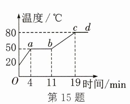 15. 将1kg某种固态物质放入加热功率恒定的装置中,对其均匀加热至沸腾,温度随时间变化的关系如图所示,该物质在ab段加热过程中内能______(增大/减小/不变),若该物质液态时的比热容为$2.4×10^{3}J/(kg·℃),$该物质在bc段吸收的热量为______J。