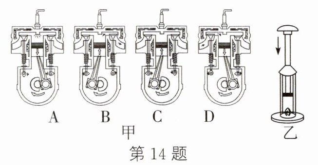 14. 小刚对家中的小汽车进行了一些研究:如图甲,一个工作循环的正确顺序是:______;若飞轮的转速为2400r/min,则在1s内汽油机对外做功______次;如图乙,在空气压缩引火仪的玻璃筒底部放入一小团干燥的硝化棉,用力把活塞迅速压下,硝化棉燃烧,该过程中是通过______的方式来改变筒内空气的内能,其能量转化情况与图______(A/B/C/D)所示汽油机冲程中的能量转化情况是一致的。