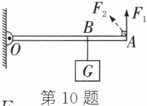 10. 如图所示,杠杆OBA可绕O点在竖直平面内转动,OB= 2BA,在B点悬挂一个10N的重物G,在A点施加竖直向上的动力$F_1,$使杠杆OBA水平平衡(杠杆重力及摩擦均忽略不计)。下列说法正确的是()