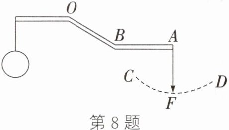 8. 如图所示,为一可绕O点转动的杠杆,在A端通过绳作用一竖直向下的拉力F使杠杆平衡,此时AB部分水平,此时F____(是/不是/不一定是)最小的拉力;保持重物静止不动,使绳绕A点从如图位置沿虚线CD顺时针转动时,F____(变大/变小/不变/先变大后变小/先变小后变大),F与其力臂的乘积____(变大/变小/不变/先变大后变小/先变小后变大)。