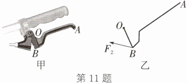 11. 如图甲是自行车的手闸,其中ABO部分可视为一个杠杆,其简化示意图如图乙,O为支点$,F_2$为阻力,请在图乙中画出: