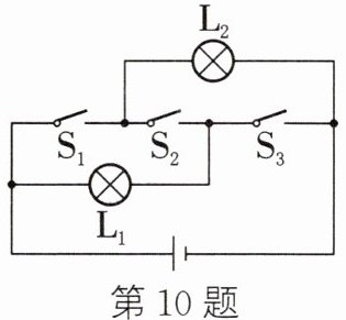10. (2024·自贡改编)在如图所示的电路图中,闭合开关$S_1、$$S_3,$断开开关$S_2,$则小灯泡$L_1、$$L_2$是______(串/并)联;断开开关$S_1、$$S_3,$闭合开关$S_2,$则小灯泡$L_1、$$L_2$是______(串/并)联;若同时闭合开关$S_1、$$S_2、$$S_3,$则会造成电路______。