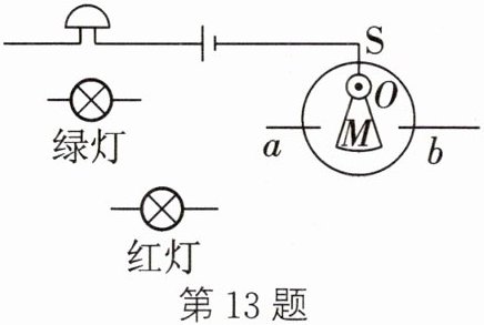 13. 某船上装有平衡警示电路,其中S为重力开关,金属片M可绕O点自由转动。当船水平时,M在a、b中间;当船左倾到一定程度时,绿灯亮、电铃响;当船右倾到一定程度时,红灯亮、电铃响。请完成电路图。