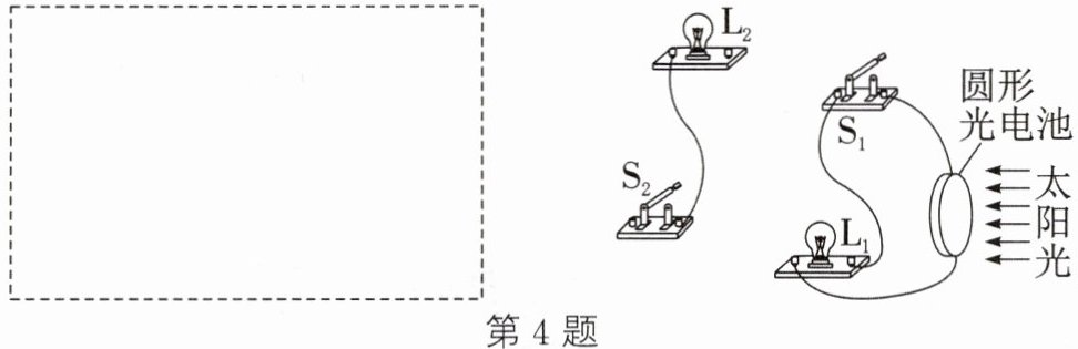 4. 用太阳能电池给两灯供电,请将电路连接完整,要求:两灯并联,使$S_{1}$控制整个电路,$S_{2}单独控制灯L_{2}$。请在虚线框内设计电路,然后用笔画线代替导线进行连线。