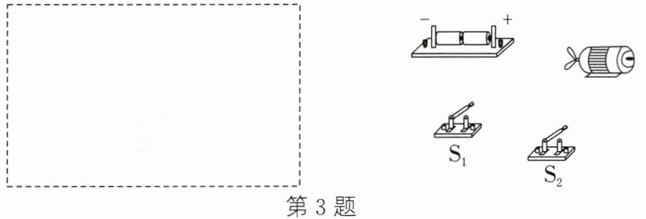3. 电动切割机有两个开关$S_{1}和S_{2}$,必须两手同时用力各压一个开关,切割机才会工作,最大限度保护操作人员。请在虚线框内设计电路(切割机用$-$M$-$表示),然后用笔画线代替导线进行连线。