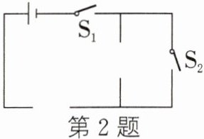 2. 如图所示的是一种声光报警器的电路图,请在图中的空缺处分别填入小灯泡和电铃的元件符号,填入后要求:当开关$S_{2}$、$S_{2}$都闭合时,电铃不响,但灯泡发光;当开关$S_{1}$闭合、$S_{2}$断开时,电铃响、灯泡发光。(电铃的符号是“$\overset{\frown }{\square }$”)