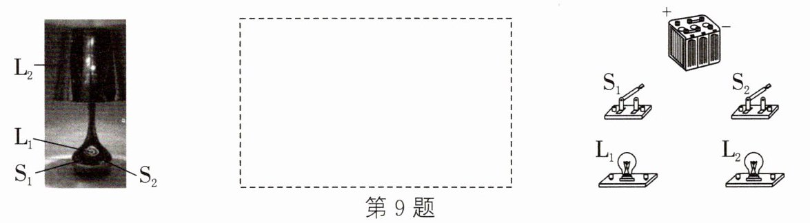 9. 如图所示的台灯,底座上有一个电源开关$S_{1}$,一个电源指示灯$L_{1}以及照明灯开关S_{2}$。当只闭合开关$S_{2}$时,照明灯泡$L_{2}$不发光;当闭合开关$S_{1}$时,电源指示灯$L_{1}$发光,再闭合开关$S_{2}$时,照明灯泡$L_{2}$发光。如果电源指示灯$L_{1}$损坏,开关$S_{1}和S_{2}$都闭合,照明灯泡$L_{2}$也能发光。请根据以上信息在虚线框中画出台灯的工作电路图,并进行实物连接。