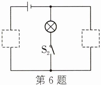 6. 将开关$S_{1}$和电动机的元件符号,分别画在图中的两个虚线框内,使之成为一个完整的电路。要求开关$S_{1}$、$S_{2}$闭合时,小灯泡和电动机均能工作。
