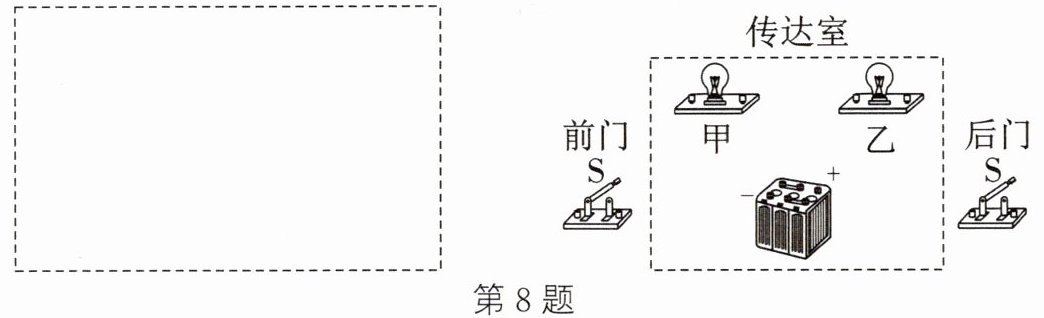 8. 学校有前、后两个门,在前、后门各装一个按钮开关,学校传达室有甲、乙两盏灯和电池组。要求前门来人按下开关时甲灯亮,后门来人按下开关时乙灯亮。根据上述要求设计电路图,并按设计的电路图在实物图上画出连线。