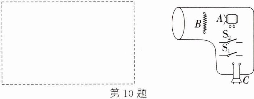 10. 如图所示是一个有冷、热两挡风的电吹风原理示意图,图中A是一只带风叶的小电动机,B是一段电热丝(电热丝用$-$▭$-$),$S_{1}$、$S_{2}$是两个开关,C是接照明电路的插头,请你用笔画线作导线按要求将这些器材连接成一个电路(连线不要交叉)。要求:只闭合$S_{1}$时吹冷风,只闭合$S_{2}$时既无风又不发热,同时闭合$S_{1}$、$S_{2}$时吹热风。请设计出电路并连线,连线时不能超出电吹风的外壳。