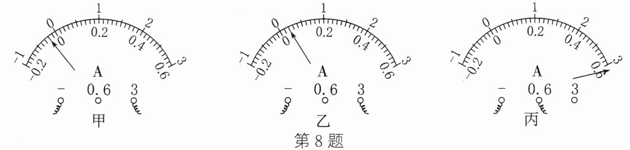 8. 小莹同学测量电流时,连接好电路,闭合开关,发现电流表指针向左偏转至图甲所示位置,原因是电流表______;断开开关,纠正错误后,再闭合开关,发现指针偏转至图乙所示位置,接下来的操作是:断开开关,______继续进行实验。当她继续测量另一条电路电流时,发现指针偏至如图丙所示位置,接下来的操作是:断开开关,______,再进行实验。