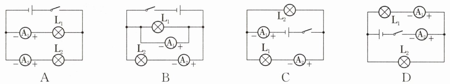 5. 用电源、开关、电流表、灯泡组成图中4个不同的电路。开关闭合后,电流表$A_{1}能直接测量通过灯泡L_{1}$电流的是()