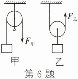 6. 如图甲、乙所示,物体的重力都是200N。若不计滑轮重、绳重和摩擦,当用力分别匀速提升物体时,$F_{甲}= $____N,$F_{乙}= $____N。若滑轮重均为20N(不计摩擦、绳重),当用力分别匀速提升物体时,$F_{甲}= $____N,$F_{乙}= $____N。如果物体被提升的高度为1m,则图甲中绳自由端移动的距离为____m,图乙中绳自由端移动的距离为____m。若物体匀速上升的速度为0.2m/s,则图甲、乙中绳自由端移动速度分别为____m/s、____m/s。