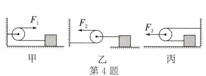 4. 如图所示,用三个滑轮分别拉同一个物体沿同一水平面做匀速直线运动,所用的拉力分别是$F_{1}$、$F_{2}$、$F_{3}$,其中最小的力为()