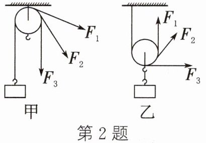 2. 在探究定滑轮和动滑轮的省力特点时,某同学做如图所示实验(不计绳子重和摩擦)。在甲图中,该同学分别用力$F_{1}$、$F_{2}$、$F_{3}$使物体匀速上升,则$F_{1}$、$F_{2}$、$F_{3}$的大小关系是____;在乙图中,该同学也分别用力$F_{1}$、$F_{2}$、$F_{3}$使物体匀速上升,则$F_{1}$、$F_{2}$、$F_{3}$的大小关系是____。