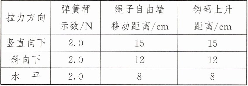 ② 如图乙,用手竖直向下匀速拉弹簧秤,记录弹簧秤示数(摩擦力忽略不计)。测量钩码和绳子自由端通过的距离,记录在下表中;