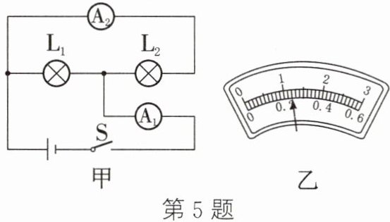 5. 在如图甲所示的电路中,当闭合开关后,两个电流表的指针偏转均为图乙所示,则灯泡$L_{1}和L_{2}$的电流分别为()
